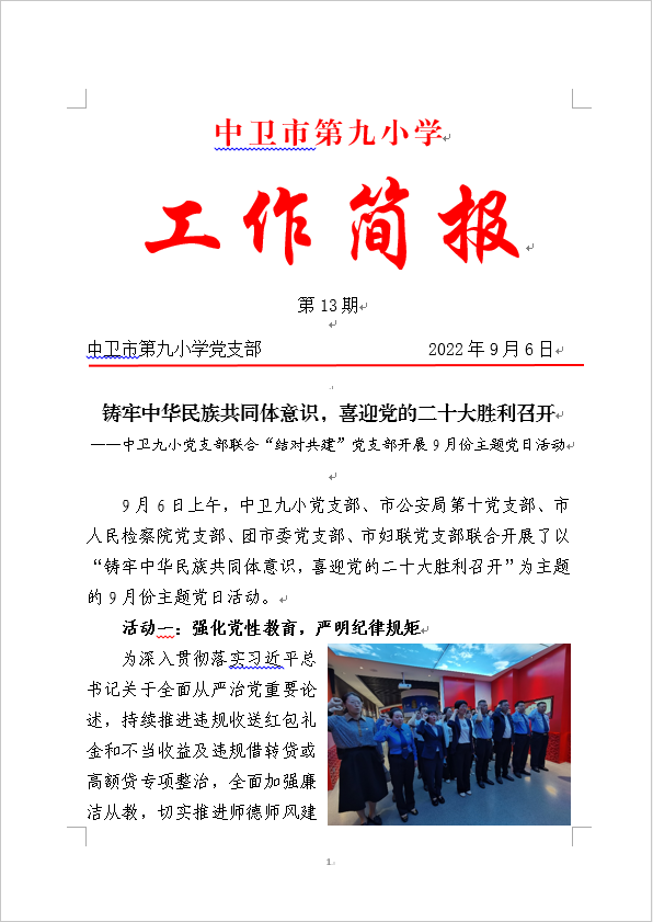 发布时间:2022-09-06 14:20 栏目:党建动态 发布单位:中卫市第九小学 点击量:2805 【公开】