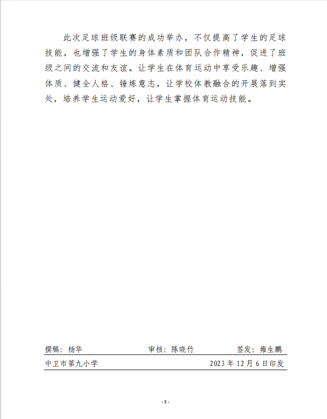 中卫九小2023年“足球嘉年华”班级联赛活动简报