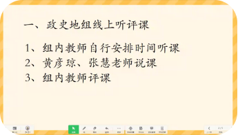由于疫情形势严峻,学校在本周继续开展线上教学活动。政史地组老师积极响应上级“停课不停学”的重要指示,除认真开展线上教学外,还定期开展教研活动,充实教学活动。