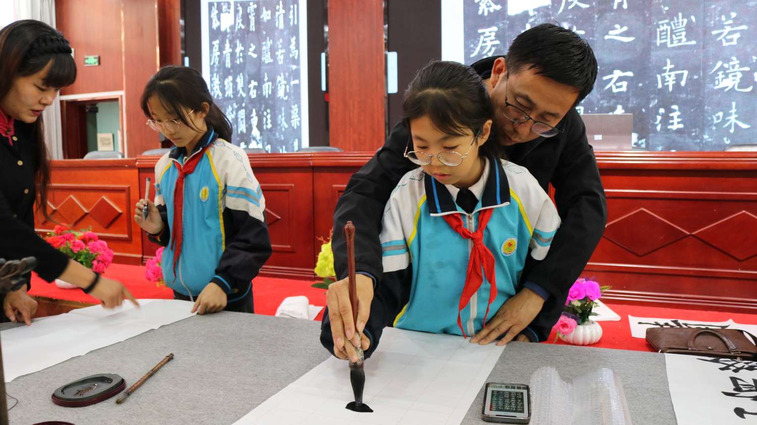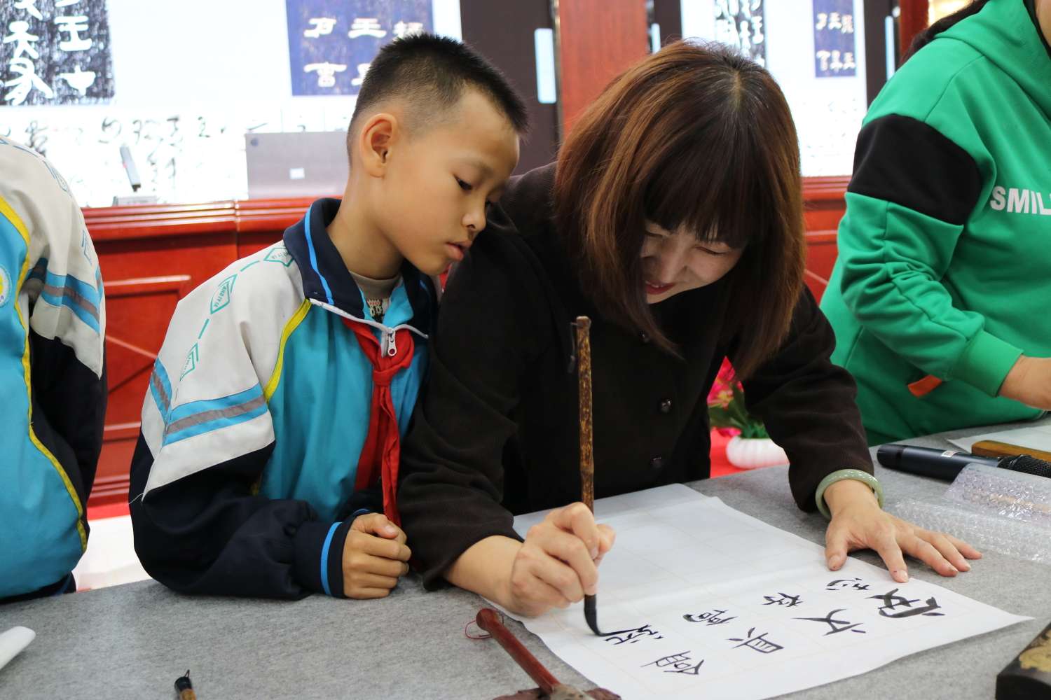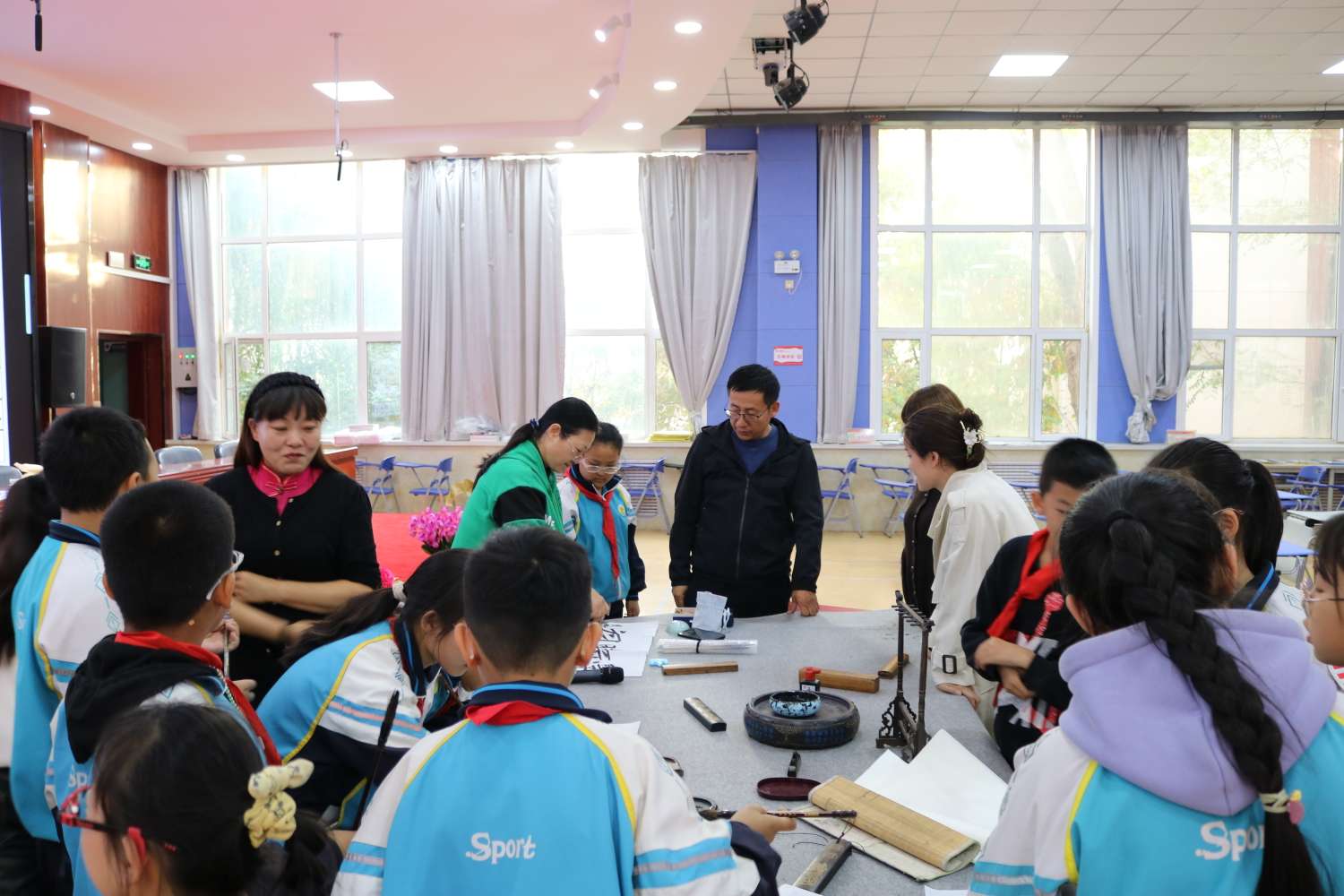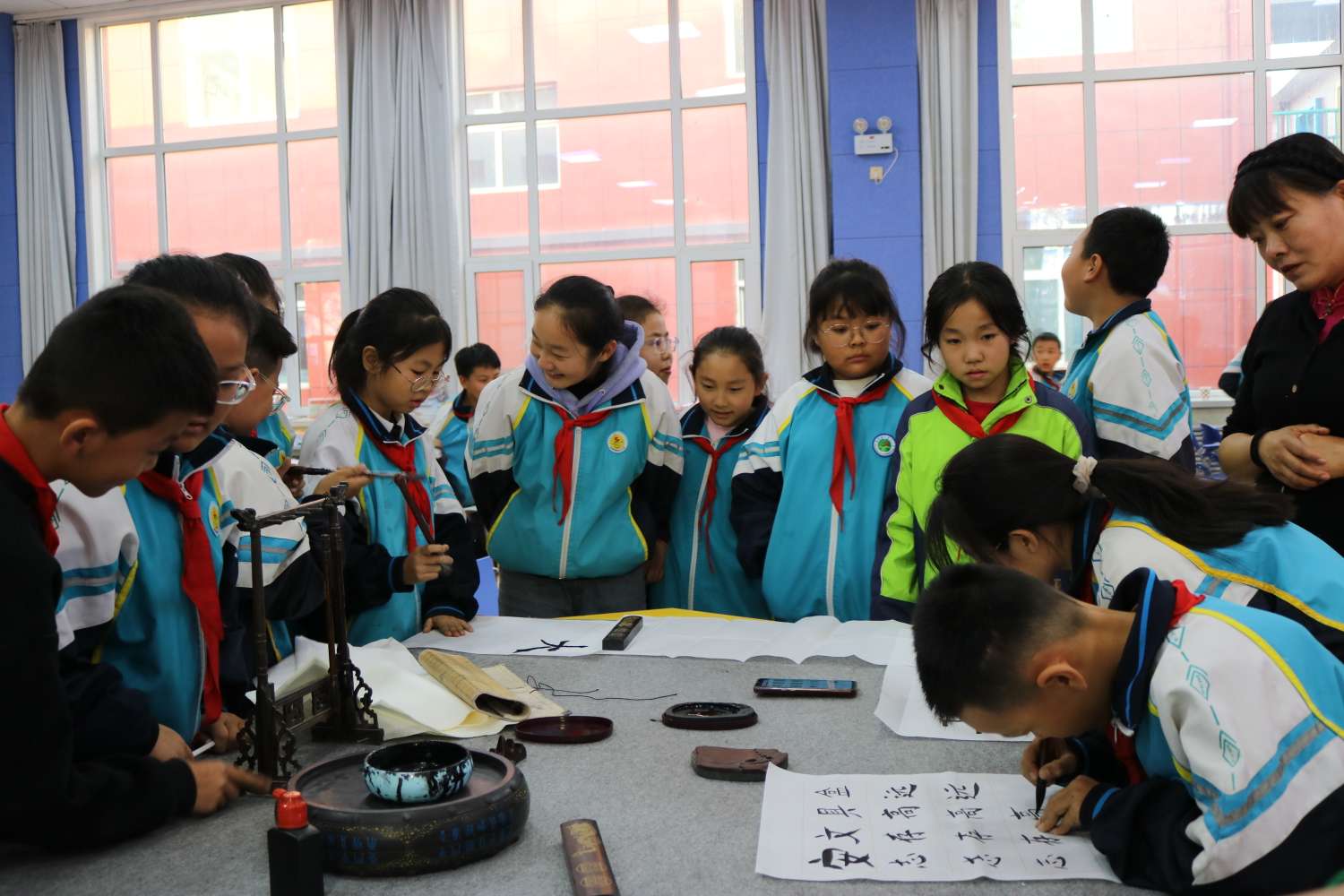 泼墨挥毫 妙手丹青。学校领导、周培贵、代红、于燕等老师和孩子们一起进行现场书法教学,传统文化知识普及和问答,共同体验汉字的意蕴、书法的魅力、书写的快乐。