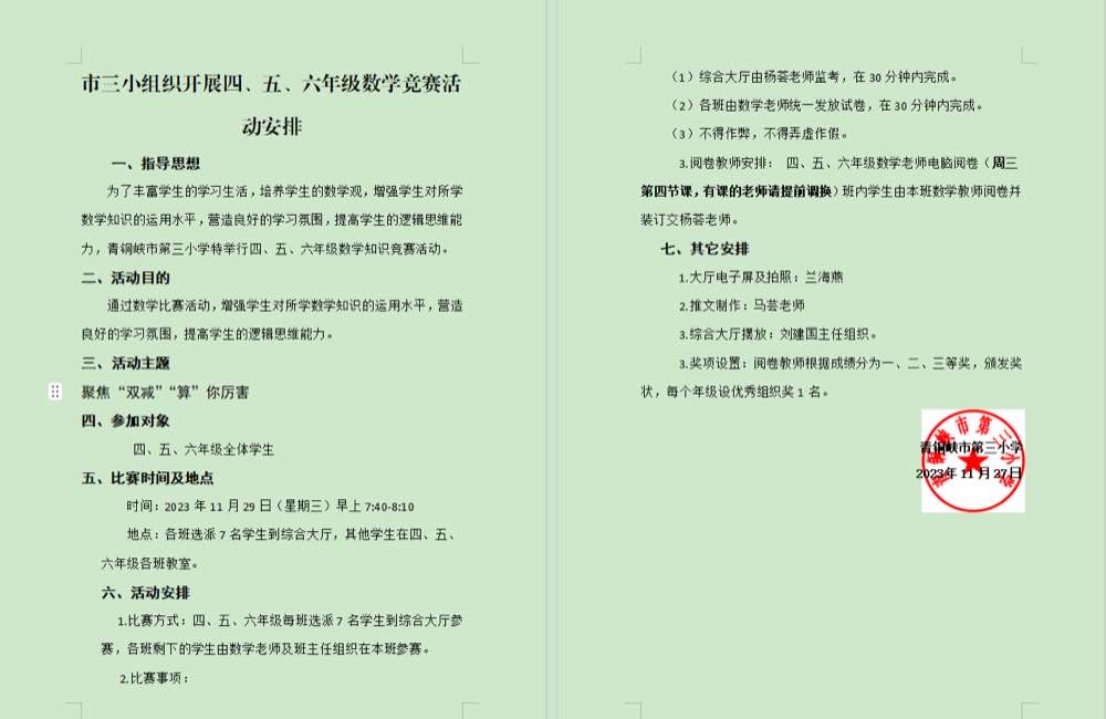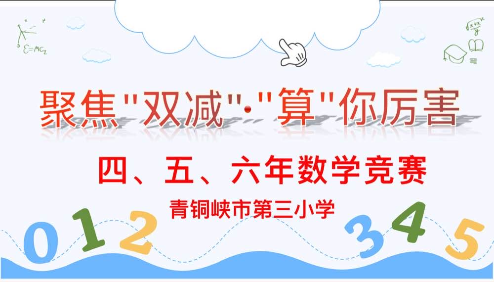 数学是一个色彩缤纷的万花筒,美丽而奇妙。在"双减"背景下,为进一步落实《数学新课程标准》,丰富校园文化生活,培养学生学习数学、钻研数学的兴趣,提高学生的数学素养,2023年11月29日,青铜峡是第三小学四、五、六年级开展了以聚焦"双减"、"算"你厉害 为主题的数学知识能力竞赛活动。