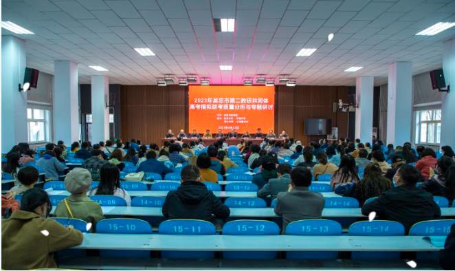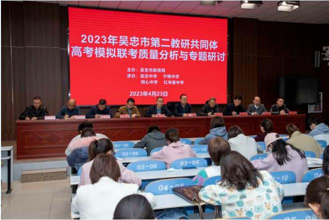 迟日江山丽,春风花草香。2023年4月23日上午,吴忠市第二教研共同体高考模拟联考质量分析与专题研讨会在吴忠中学举行。会议由吴忠中学副校长马利军主持,市教育局副局长柳佳伟、教研室主任麦昌虎、副主任陈建建,吴忠中学党总支书记王友成、校长胡锋及宁朔中学、同心中学、红寺堡中学校长和各学校高三全体教师参会。