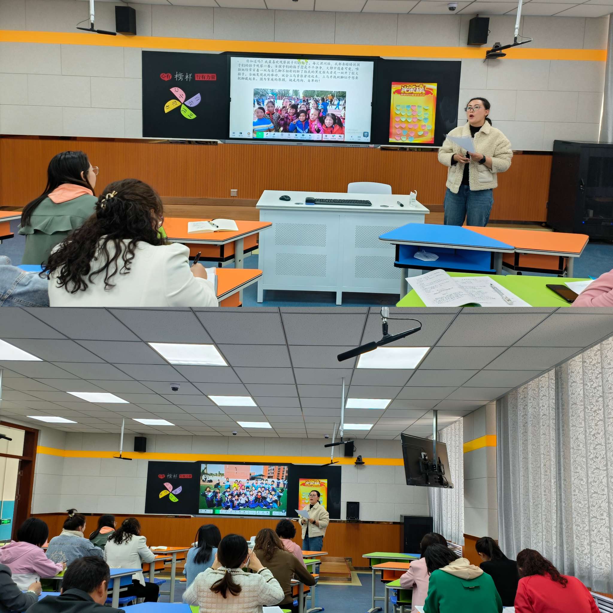 接着王婷老师的育人故事在轻缓的音乐中展开。王老师从自己十几年带班情况分析了“用爱温暖每个孩子的心灵”实质内涵。家访、谈心、观察细微的关爱中让学生真心体会到爱的滋味。希望在自己有生的教学生涯中,用真心真爱的一束小小的光,照亮学生以后明亮的道路。并以爱为基,以理解为翼,以勤勉为媒,让爱的火花永远绽放到每个学生的心理。引发了听课老师的思考,“爱学生,坚持不懈的爱下去”,也许就能收获不一样的效果。