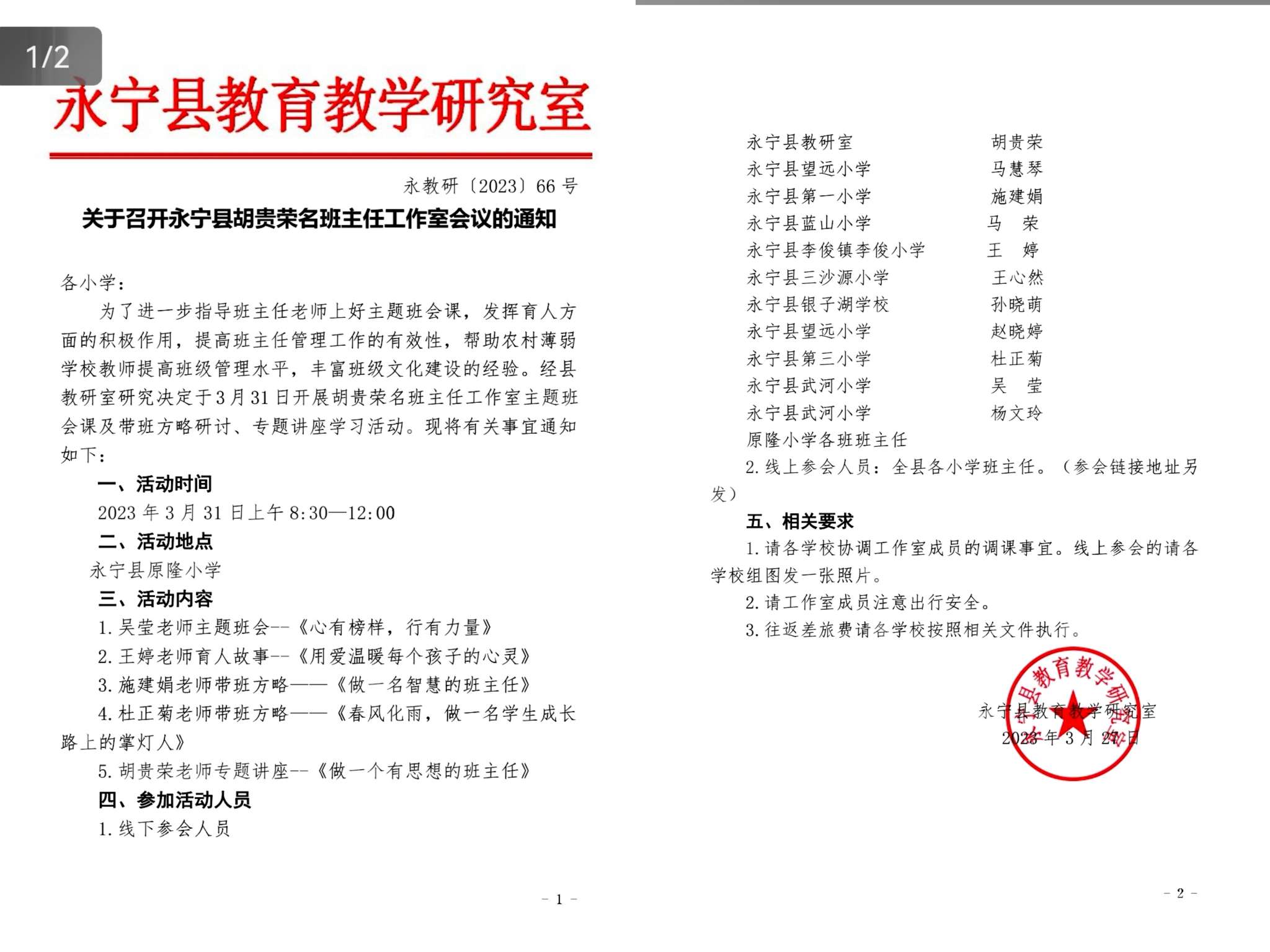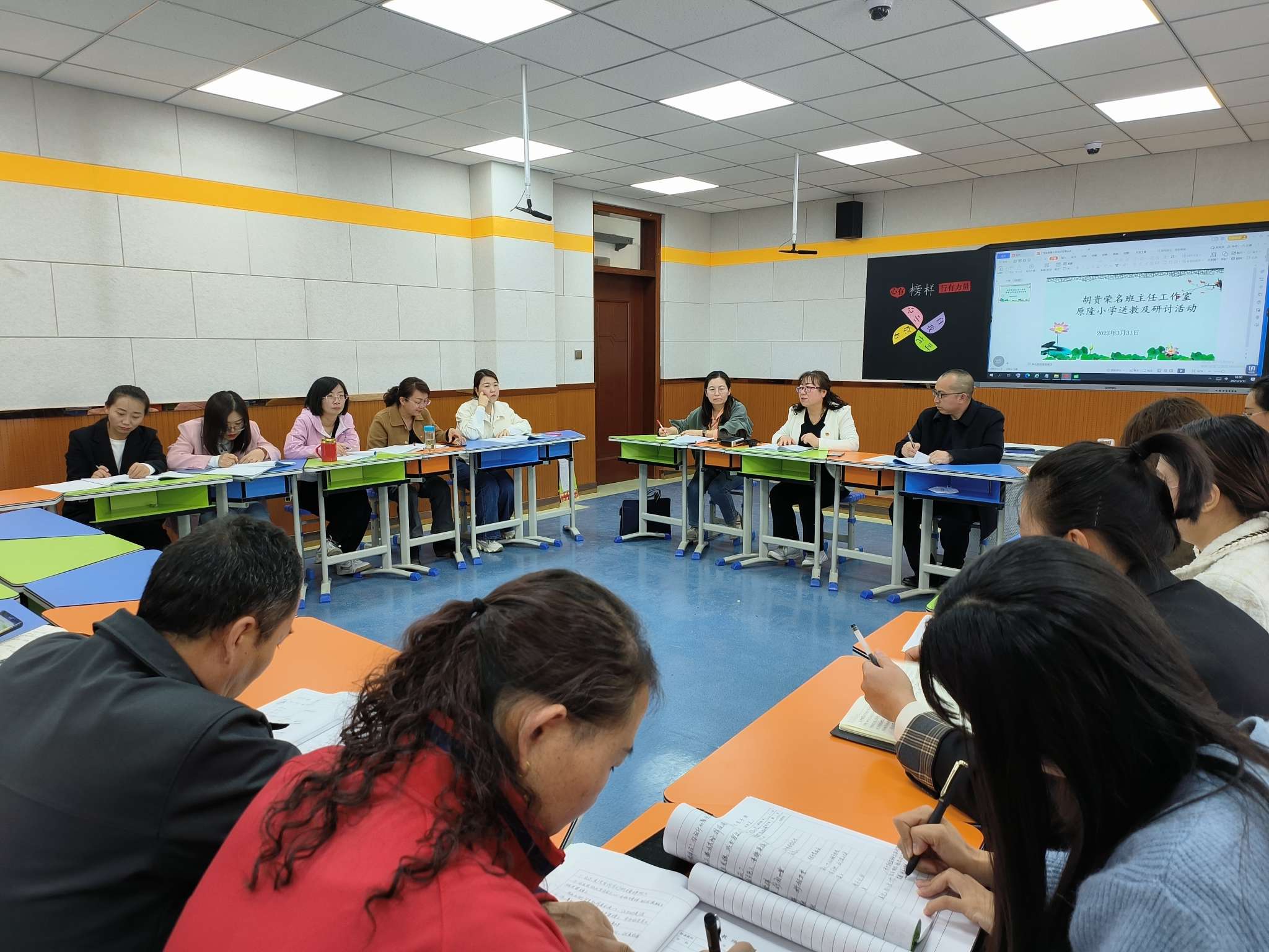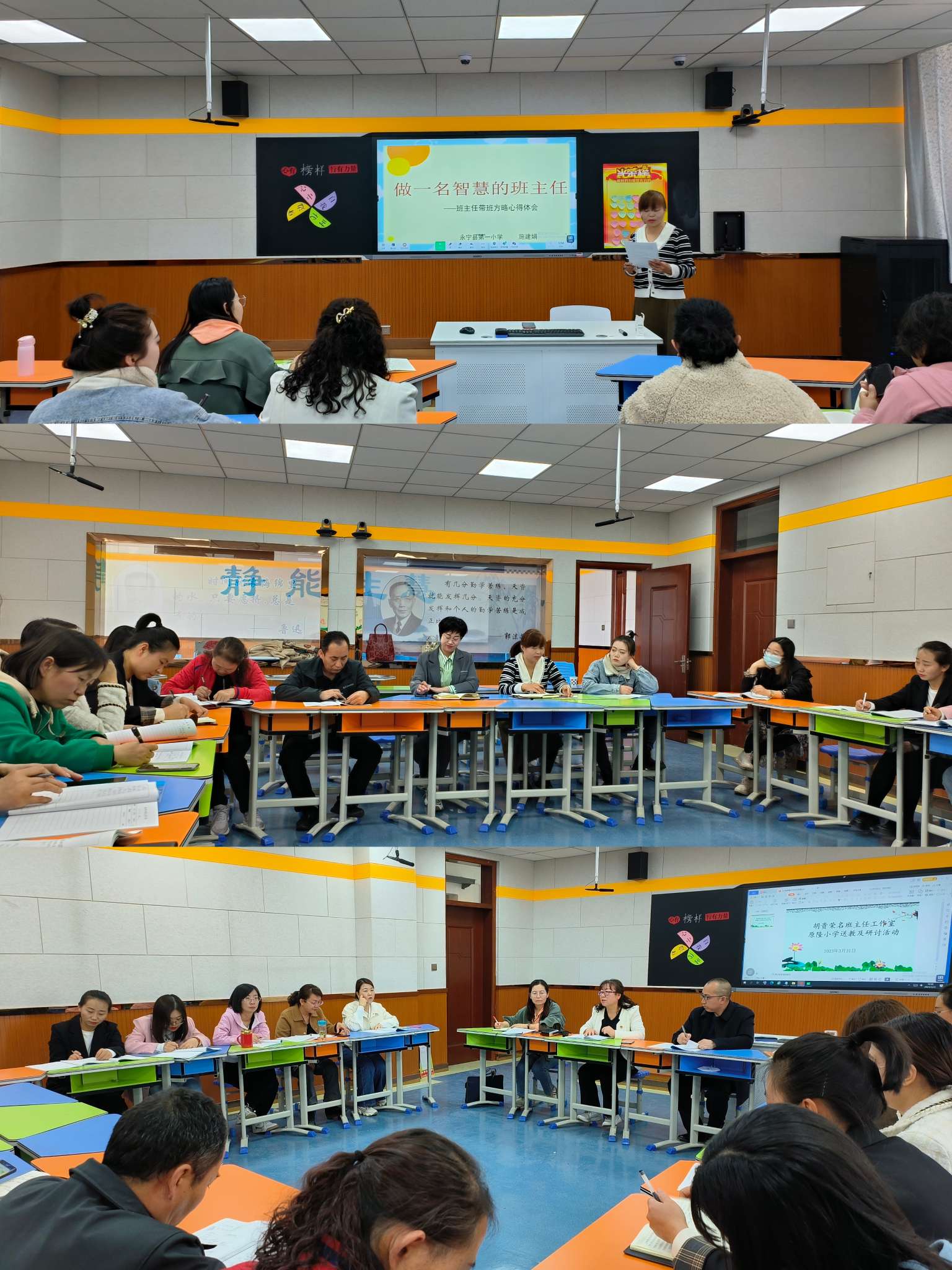 在这个泥融飞燕,沙暖睡鸥的春日,为了使每一位班主任更加明确自己的职责与目标,引导学生认识到德育的重要性。3月31日,永宁县胡贵荣名班主任工作室送教研讨到原隆小学。所有成员及线上各小学班主任一起参加了主题为“研修花开春光中,同心掬得满庭花”的送教研讨活动。