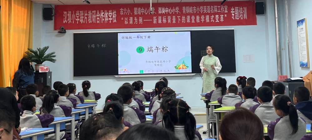 接着,大家共同观摩了陈袁滩中心小学常玲霞老师执教的部编版语文一年级下册《端午粽》一课。常老师采用"小吃货"游戏猜谜导入,激发学生兴趣,教学过程中用她亲和的教态和语言引导,让学生耳目一新,整个课堂活泼有趣,大家都沉浸在知识的海洋里。