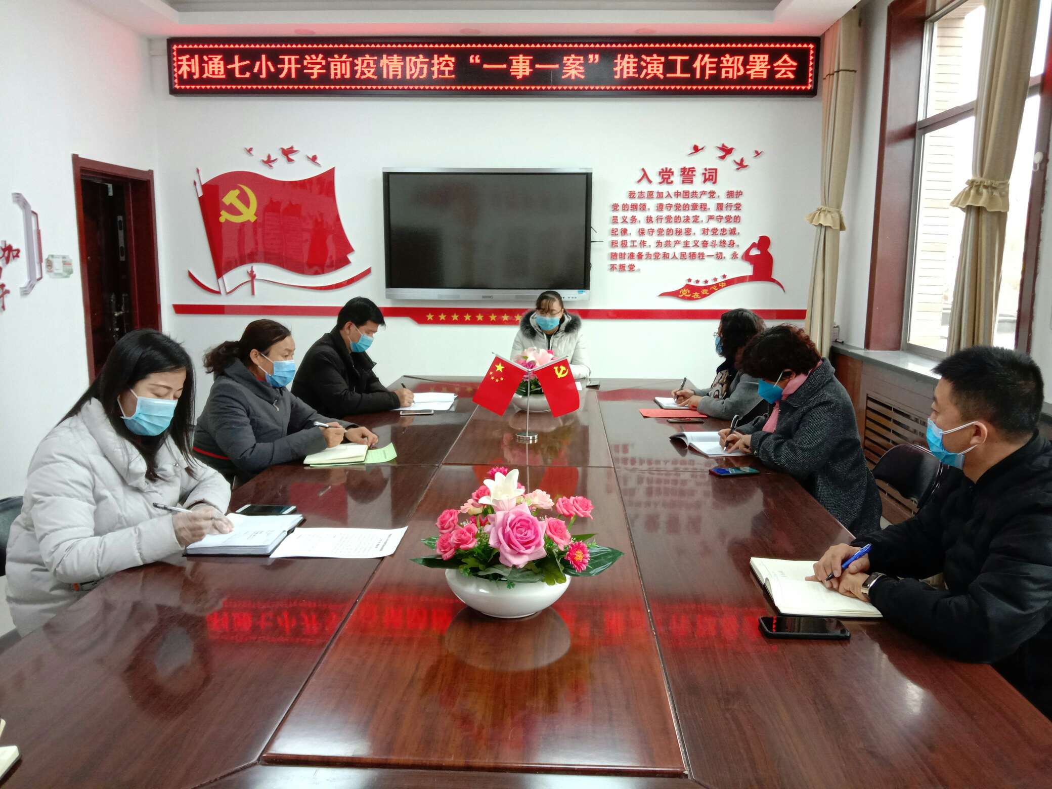 前期,为更好迎接孩子们返校,按照利通区教育局要求,政教处精心制定了落地七小校情的“两案九制”。七小的中层以上领导们在校长李欣芳的带领下就政教处制定的方案、制度、规定等反复开会、反复商讨、反复研磨。孩子们入校测体温怎么办?上卫生间、喝水怎么组织能避免聚集?课间活动怎么做既能让孩子们尽情玩耍又能有序安全不扎堆……每一个细节,每一项措施,每一个决定因牵动着一千多个生命的健康而显得尤为重要。功夫不负有心人,在经历了6次的修改稿后确定稿终于新鲜出炉,政教处将其装订成册,以待实施。装订成册只是开端,预案终究不那么让我们放心,因为对孩子们的爱所以更在乎预案的实效性、科学性!落在纸上仅仅完成了第一步,标准化、程序化、轻车熟路的落实在实际行动中才能让我们更放心!在2020年2月27日这一天,虽然天空并不晴朗,但我们的内心兴奋不已。实践是检验真理的唯一标准,没有学生,我们就来当一回学生。上午9时30分,利通区第七小学应对新冠肺炎疫情防控“一事一案”推演活动在提前召开了部署会议之后顺利拉开了帷幕。