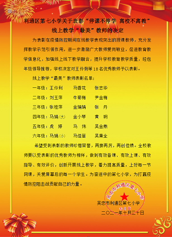 希望受到表彰的教师珍惜荣誉,再接再厉,再创佳绩。全校教师要以受表彰的优秀教师为榜样,做到有效备课、有效上课、有效指导、有效评价,创新开展线上教学,着力提高质量,上好每一节网课,关爱屏幕后的每一个学生。为奋进中的第七小学,为打赢疫情防控阻击战贡献自己的力量。